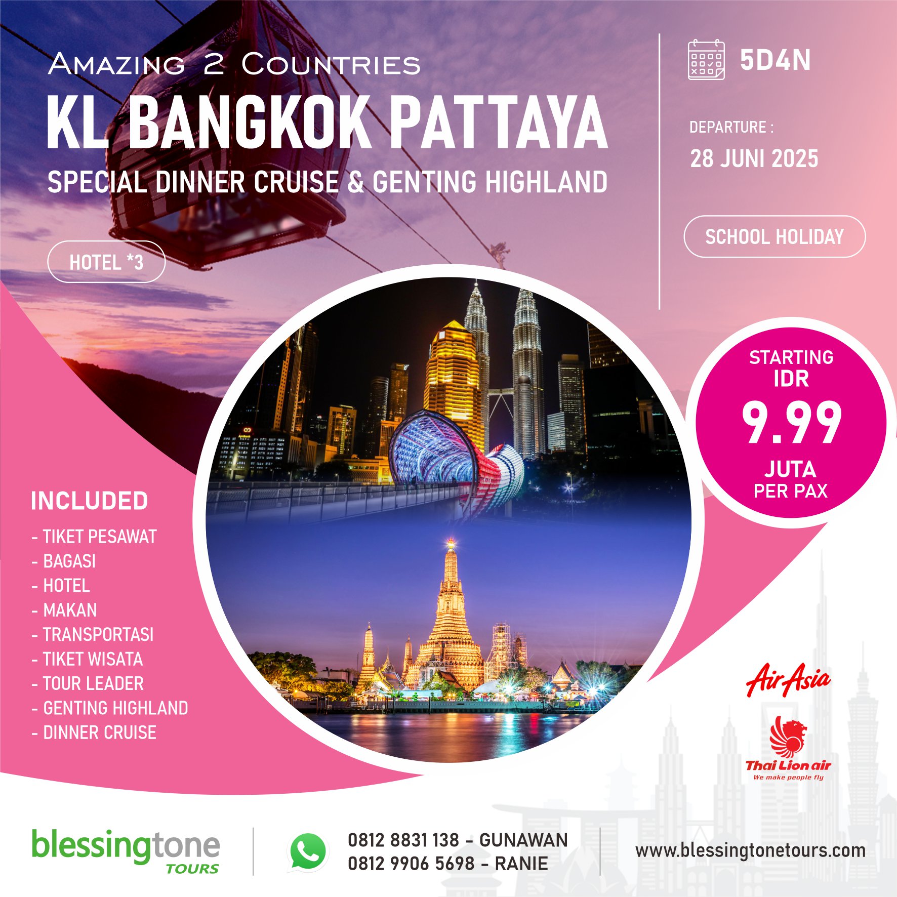 • Tiket Pesawat Jakarta – KL, KL – Bangkok dan Bangkok – Jakarta; Kelas Economy, LCC Flight by Air Asia / Thai Lion Air